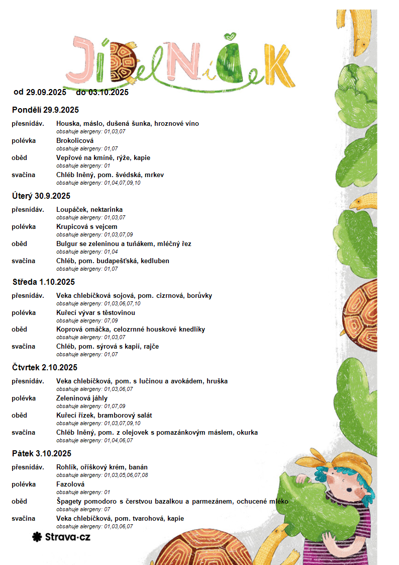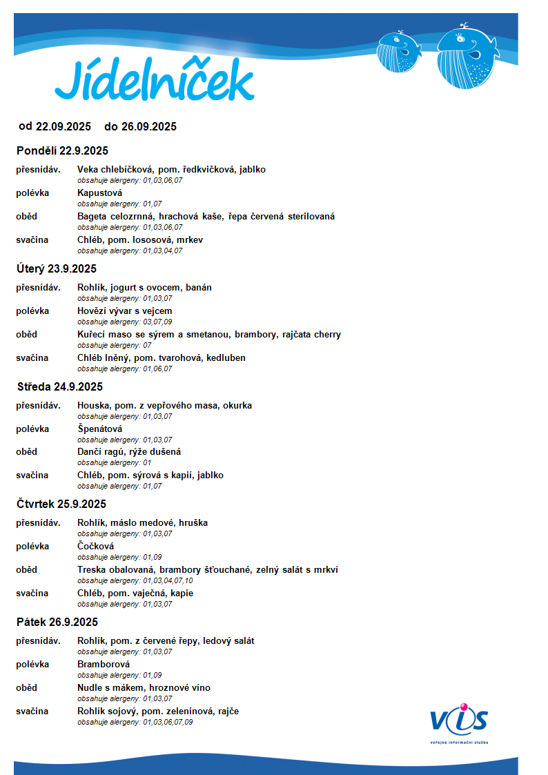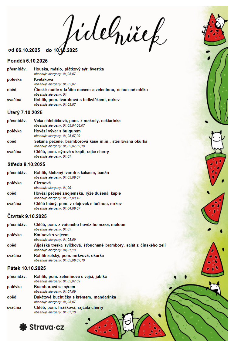 Změna jídelníčku vyhrazena. Pokrmy jsou určeny k okamžité spotřebě.